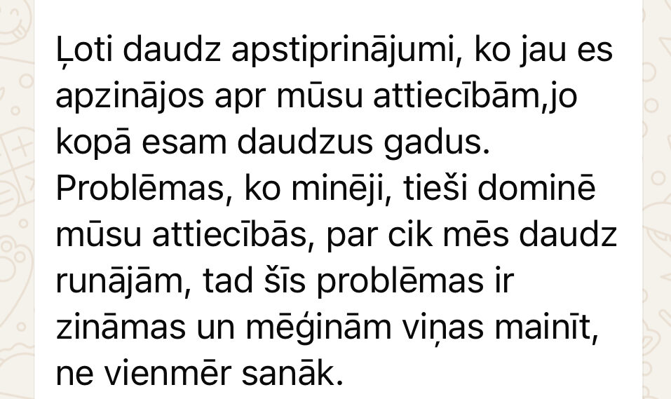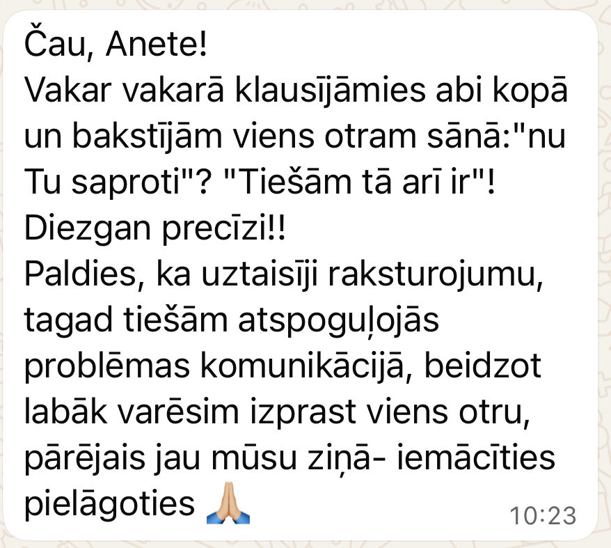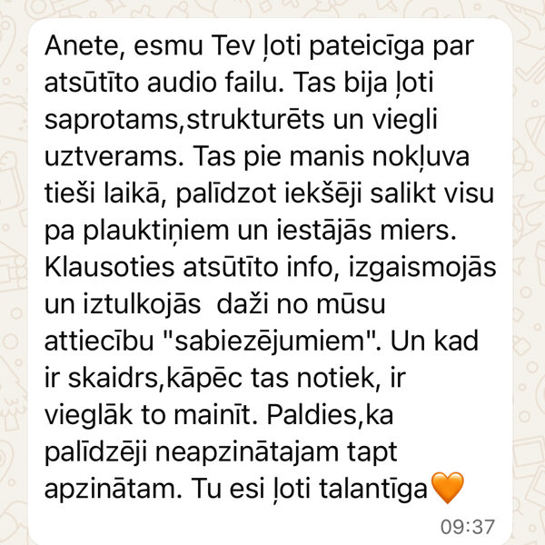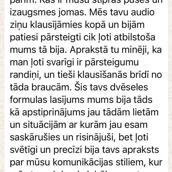 • audio formātā (WhatsApp) , nusūtu Tev 20-30 min garu audio ziņu, kurā izskaidroju jūsu saderības rādītājus